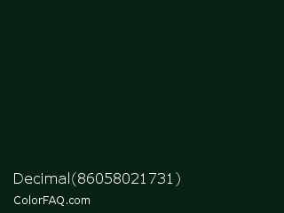 Decimal 86058021731 Color is a almost black green color and the nearest color is Palm Green #09230f. Hex code #072113 and RGB value is rgb(7,33,19). In RGB color space, this color is composed of 3% red, 13% green, 7% blue, In CMYK color space, this color is composed of 79% cyan, 0% magenta, 42% yellow , 87% black , In HSL color space, this color has a hue angle of 148° , 65% saturation and 8% lightness.