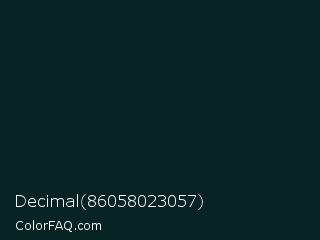 Decimal 86058023057 Color is a almost black cyan color and the nearest color is Swamp #001b1c. Hex code #072323 and RGB value is rgb(7,35,35). In RGB color space, this color is composed of 3% red, 14% green, 14% blue, In CMYK color space, this color is composed of 80% cyan, 0% magenta, 0% yellow , 86% black , In HSL color space, this color has a hue angle of 180° , 67% saturation and 8% lightness.