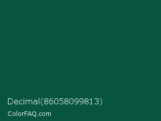 Decimal 86058099813 Color is a very dark cyan color and the nearest color is Sacramento State Green #00563f. Hex code #075441 and RGB value is rgb(7,84,65). In RGB color space, this color is composed of 3% red, 33% green, 25% blue, In CMYK color space, this color is composed of 92% cyan, 0% magenta, 23% yellow , 67% black , In HSL color space, this color has a hue angle of 165° , 85% saturation and 18% lightness.