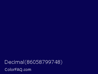 Decimal 86058799748 Color is a very dark indigo color and the nearest color is Gulf Blue #051657. Hex code #080354 and RGB value is rgb(8,3,84). In RGB color space, this color is composed of 3% red, 1% green, 33% blue, In CMYK color space, this color is composed of 90% cyan, 96% magenta, 0% yellow , 67% black , In HSL color space, this color has a hue angle of 244° , 93% saturation and 17% lightness.