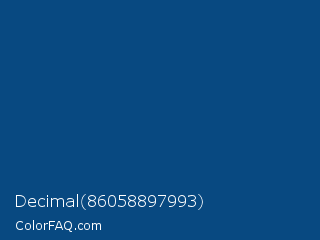Decimal 86058897993 Color is a dark blue color and the nearest color is Dark Cerulean #08457e. Hex code #084981 and RGB value is rgb(8,73,129). In RGB color space, this color is composed of 3% red, 29% green, 51% blue, In CMYK color space, this color is composed of 94% cyan, 43% magenta, 0% yellow , 49% black , In HSL color space, this color has a hue angle of 208° , 88% saturation and 27% lightness.