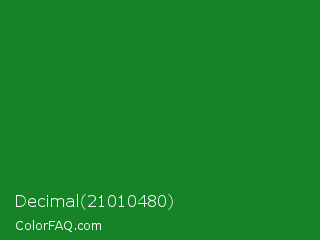 Decimal 21010480 Color is a dark green color and the nearest color is Forest Green #228b22. Hex code #158326 and RGB value is rgb(21,131,38). In RGB color space, this color is composed of 8% red, 51% green, 15% blue, In CMYK color space, this color is composed of 84% cyan, 0% magenta, 71% yellow , 49% black , In HSL color space, this color has a hue angle of 129° , 72% saturation and 30% lightness.