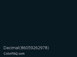 Decimal 86059262978 Color is a almost black blue color and the nearest color is Black Pearl #041322. Hex code #091922 and RGB value is rgb(9,25,34). In RGB color space, this color is composed of 4% red, 10% green, 13% blue, In CMYK color space, this color is composed of 74% cyan, 26% magenta, 0% yellow , 87% black , In HSL color space, this color has a hue angle of 202° , 58% saturation and 8% lightness.