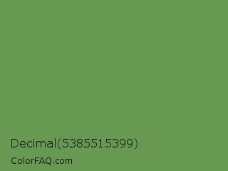Decimal 5385515399 Color is a normal green color and the nearest color is Palm Leaf #6f9940. Hex code #679953 and RGB value is rgb(103,153,83). In RGB color space, this color is composed of 40% red, 60% green, 33% blue, In CMYK color space, this color is composed of 33% cyan, 0% magenta, 46% yellow , 40% black , In HSL color space, this color has a hue angle of 103° , 30% saturation and 46% lightness.
