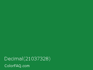 Decimal 21037328 Color is a dark green color and the nearest color is Salem #097f4b. Hex code #15843e and RGB value is rgb(21,132,62). In RGB color space, this color is composed of 8% red, 52% green, 24% blue, In CMYK color space, this color is composed of 84% cyan, 0% magenta, 53% yellow , 48% black , In HSL color space, this color has a hue angle of 142° , 73% saturation and 30% lightness.