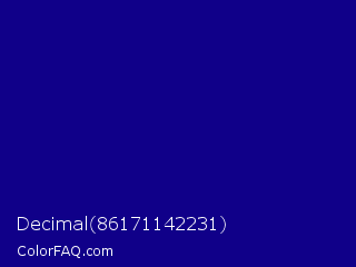 Decimal 86171142231 Color is a dark indigo color and the nearest color is Ultramarine #120a8f. Hex code #100089 and RGB value is rgb(16,0,137). In RGB color space, this color is composed of 6% red, 0% green, 54% blue, In CMYK color space, this color is composed of 88% cyan, 100% magenta, 0% yellow , 46% black , In HSL color space, this color has a hue angle of 247° , 100% saturation and 27% lightness.