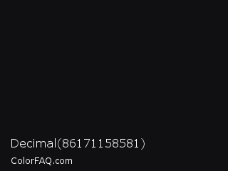 Decimal 86171158581 Color is a almost black blue color and the nearest color is Bunker #0d1117. Hex code #101013 and RGB value is rgb(16,16,19). In RGB color space, this color is composed of 6% red, 6% green, 7% blue, In CMYK color space, this color is composed of 16% cyan, 16% magenta, 0% yellow , 93% black , In HSL color space, this color has a hue angle of 240° , 9% saturation and 7% lightness.