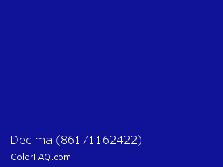 Decimal 86171162422 Color is a normal blue color and the nearest color is Ultramarine #120a8f. Hex code #101398 and RGB value is rgb(16,19,152). In RGB color space, this color is composed of 6% red, 7% green, 60% blue, In CMYK color space, this color is composed of 89% cyan, 88% magenta, 0% yellow , 40% black , In HSL color space, this color has a hue angle of 239° , 81% saturation and 33% lightness.