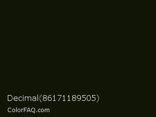 Decimal 86171189505 Color is a almost black lime color and the nearest color is Green Waterloo #101405. Hex code #101505 and RGB value is rgb(16,21,5). In RGB color space, this color is composed of 6% red, 8% green, 2% blue, In CMYK color space, this color is composed of 24% cyan, 0% magenta, 76% yellow , 92% black , In HSL color space, this color has a hue angle of 79° , 62% saturation and 5% lightness.