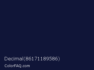 Decimal 86171189586 Color is a very dark blue color and the nearest color is Haiti #1b1035. Hex code #101538 and RGB value is rgb(16,21,56). In RGB color space, this color is composed of 6% red, 8% green, 22% blue, In CMYK color space, this color is composed of 71% cyan, 63% magenta, 0% yellow , 78% black , In HSL color space, this color has a hue angle of 233° , 56% saturation and 14% lightness.