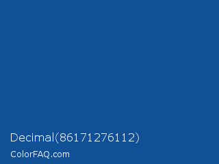 Decimal 86171276112 Color is a normal blue color and the nearest color is Yale Blue #0f4d92. Hex code #105096 and RGB value is rgb(16,80,150). In RGB color space, this color is composed of 6% red, 31% green, 59% blue, In CMYK color space, this color is composed of 89% cyan, 47% magenta, 0% yellow , 41% black , In HSL color space, this color has a hue angle of 211° , 81% saturation and 33% lightness.