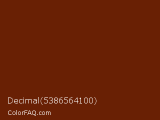 Decimal 5386564100 Color is a very dark orange color and the nearest color is Cedar Wood Finish #711a00. Hex code #692004 and RGB value is rgb(105,32,4). In RGB color space, this color is composed of 41% red, 13% green, 2% blue, In CMYK color space, this color is composed of 0% cyan, 70% magenta, 96% yellow , 59% black , In HSL color space, this color has a hue angle of 17° , 93% saturation and 21% lightness.
