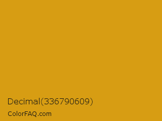 Decimal 336790609 Color is a normal orange color and the nearest color is Gamboge #e49b0f. Hex code #d79d13 and RGB value is rgb(215,157,19). In RGB color space, this color is composed of 84% red, 62% green, 7% blue, In CMYK color space, this color is composed of 0% cyan, 27% magenta, 91% yellow , 16% black , In HSL color space, this color has a hue angle of 42° , 84% saturation and 46% lightness.