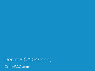 Decimal 21049444 Color is a normal blue color and the nearest color is Cyan Cornflower Blue #188bc2. Hex code #158fc8 and RGB value is rgb(21,143,200). In RGB color space, this color is composed of 8% red, 56% green, 78% blue, In CMYK color space, this color is composed of 90% cyan, 29% magenta, 0% yellow , 22% black , In HSL color space, this color has a hue angle of 199° , 81% saturation and 43% lightness.