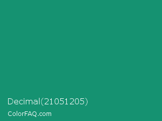Decimal 21051205 Color is a normal cyan color and the nearest color is Elf Green #088370. Hex code #159271 and RGB value is rgb(21,146,113). In RGB color space, this color is composed of 8% red, 57% green, 44% blue, In CMYK color space, this color is composed of 86% cyan, 0% magenta, 23% yellow , 43% black , In HSL color space, this color has a hue angle of 164° , 75% saturation and 33% lightness.