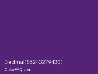 Decimal 86243279430 Color is a dark purple color and the nearest color is Honey Flower #4f1c70. Hex code #542376 and RGB value is rgb(84,35,118). In RGB color space, this color is composed of 33% red, 14% green, 46% blue, In CMYK color space, this color is composed of 29% cyan, 70% magenta, 0% yellow , 54% black , In HSL color space, this color has a hue angle of 275° , 54% saturation and 30% lightness.