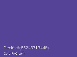 Decimal 86243313448 Color is a normal indigo color and the nearest color is Victoria #534491. Hex code #544498 and RGB value is rgb(84,68,152). In RGB color space, this color is composed of 33% red, 27% green, 60% blue, In CMYK color space, this color is composed of 45% cyan, 55% magenta, 0% yellow , 40% black , In HSL color space, this color has a hue angle of 251° , 38% saturation and 43% lightness.