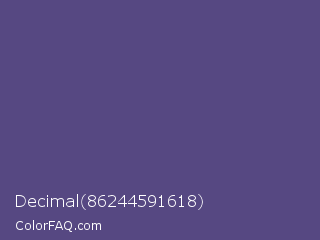 Decimal 86244591618 Color is a normal indigo color and the nearest color is Cyber Grape #58427c. Hex code #564882 and RGB value is rgb(86,72,130). In RGB color space, this color is composed of 34% red, 28% green, 51% blue, In CMYK color space, this color is composed of 34% cyan, 45% magenta, 0% yellow , 49% black , In HSL color space, this color has a hue angle of 254° , 29% saturation and 40% lightness.