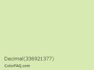 Decimal 336921377 Color is a very light green color and the nearest color is Caper #dcedb4. Hex code #d7eab1 and RGB value is rgb(215,234,177). In RGB color space, this color is composed of 84% red, 92% green, 69% blue, In CMYK color space, this color is composed of 8% cyan, 0% magenta, 24% yellow , 8% black , In HSL color space, this color has a hue angle of 80° , 58% saturation and 81% lightness.