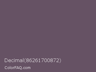 Decimal 86261700872 Color is a normal magenta color and the nearest color is Zambezi #685558. Hex code #665264 and RGB value is rgb(102,82,100). In RGB color space, this color is composed of 40% red, 32% green, 39% blue, In CMYK color space, this color is composed of 0% cyan, 20% magenta, 2% yellow , 60% black , In HSL color space, this color has a hue angle of 306° , 11% saturation and 36% lightness.