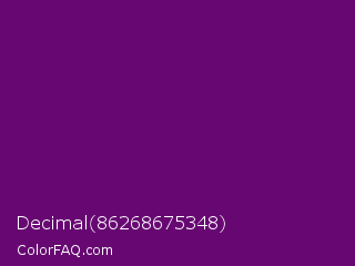 Decimal 86268675348 Color is a dark magenta color and the nearest color is Patriarch #800080. Hex code #670872 and RGB value is rgb(103,8,114). In RGB color space, this color is composed of 40% red, 3% green, 45% blue, In CMYK color space, this color is composed of 10% cyan, 93% magenta, 0% yellow , 55% black , In HSL color space, this color has a hue angle of 294° , 87% saturation and 24% lightness.