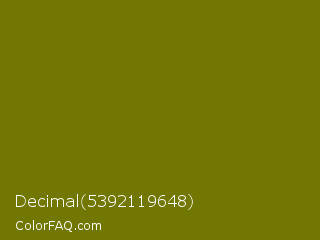 Decimal 5392119648 Color is a dark yellow color and the nearest color is Bronze Yellow #737000. Hex code #717700 and RGB value is rgb(113,119,0). In RGB color space, this color is composed of 44% red, 47% green, 0% blue, In CMYK color space, this color is composed of 5% cyan, 0% magenta, 100% yellow , 53% black , In HSL color space, this color has a hue angle of 63° , 100% saturation and 23% lightness.