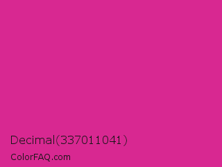 Decimal 337011041 Color is a normal magenta color and the nearest color is Barbie Pink #e0218a. Hex code #d82891 and RGB value is rgb(216,40,145). In RGB color space, this color is composed of 85% red, 16% green, 57% blue, In CMYK color space, this color is composed of 0% cyan, 81% magenta, 33% yellow , 15% black , In HSL color space, this color has a hue angle of 324° , 69% saturation and 50% lightness.