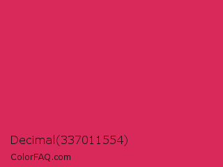 Decimal 337011554 Color is a normal rose color and the nearest color is Cerise Red #de3163. Hex code #d8295a and RGB value is rgb(216,41,90). In RGB color space, this color is composed of 85% red, 16% green, 35% blue, In CMYK color space, this color is composed of 0% cyan, 81% magenta, 58% yellow , 15% black , In HSL color space, this color has a hue angle of 343° , 69% saturation and 50% lightness.