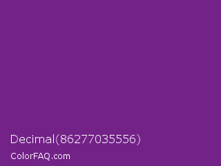 Decimal 86277035556 Color is a normal purple color and the nearest color is Seance #731e8f. Hex code #732288 and RGB value is rgb(115,34,136). In RGB color space, this color is composed of 45% red, 13% green, 53% blue, In CMYK color space, this color is composed of 15% cyan, 75% magenta, 0% yellow , 47% black , In HSL color space, this color has a hue angle of 288° , 60% saturation and 33% lightness.