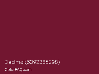 Decimal 5392385298 Color is a dark rose color and the nearest color is Claret #7f1734. Hex code #721630 and RGB value is rgb(114,22,48). In RGB color space, this color is composed of 45% red, 9% green, 19% blue, In CMYK color space, this color is composed of 0% cyan, 81% magenta, 58% yellow , 55% black , In HSL color space, this color has a hue angle of 343° , 68% saturation and 27% lightness.