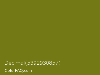 Decimal 5392930857 Color is a dark yellow color and the nearest color is Olivetone #716e10. Hex code #727915 and RGB value is rgb(114,121,21). In RGB color space, this color is composed of 45% red, 47% green, 8% blue, In CMYK color space, this color is composed of 6% cyan, 0% magenta, 83% yellow , 53% black , In HSL color space, this color has a hue angle of 64° , 70% saturation and 28% lightness.
