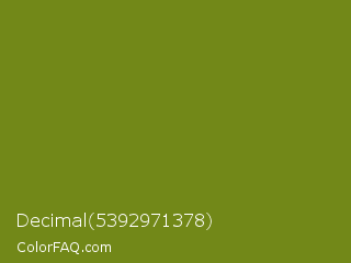 Decimal 5392971378 Color is a normal lime color and the nearest color is Trendy Green #7c881a. Hex code #728818 and RGB value is rgb(114,136,24). In RGB color space, this color is composed of 45% red, 53% green, 9% blue, In CMYK color space, this color is composed of 16% cyan, 0% magenta, 82% yellow , 47% black , In HSL color space, this color has a hue angle of 72° , 70% saturation and 31% lightness.