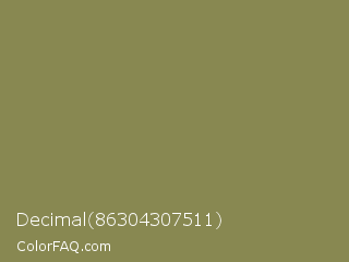 Decimal 86304307511 Color is a normal yellow color and the nearest color is Dark Tan #918151. Hex code #888851 and RGB value is rgb(136,136,81). In RGB color space, this color is composed of 53% red, 53% green, 32% blue, In CMYK color space, this color is composed of 0% cyan, 0% magenta, 40% yellow , 47% black , In HSL color space, this color has a hue angle of 60° , 25% saturation and 43% lightness.
