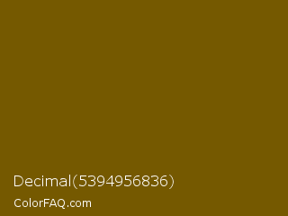 Decimal 5394956836 Color is a dark yellow color and the nearest color is Yukon Gold #7b6608. Hex code #755900 and RGB value is rgb(117,89,0). In RGB color space, this color is composed of 46% red, 35% green, 0% blue, In CMYK color space, this color is composed of 0% cyan, 24% magenta, 100% yellow , 54% black , In HSL color space, this color has a hue angle of 46° , 100% saturation and 23% lightness.