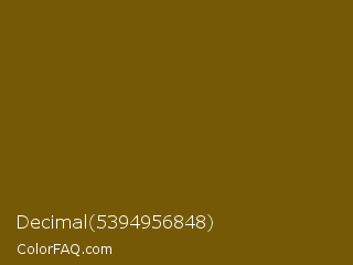Decimal 5394956848 Color is a dark orange color and the nearest color is Spicy Mustard #74640d. Hex code #755906 and RGB value is rgb(117,89,6). In RGB color space, this color is composed of 46% red, 35% green, 2% blue, In CMYK color space, this color is composed of 0% cyan, 24% magenta, 95% yellow , 54% black , In HSL color space, this color has a hue angle of 45° , 90% saturation and 24% lightness.