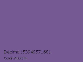 Decimal 5394957168 Color is a normal violet color and the nearest color is Dark Lavender #734f96. Hex code #755992 and RGB value is rgb(117,89,146). In RGB color space, this color is composed of 46% red, 35% green, 57% blue, In CMYK color space, this color is composed of 20% cyan, 39% magenta, 0% yellow , 43% black , In HSL color space, this color has a hue angle of 269° , 24% saturation and 46% lightness.