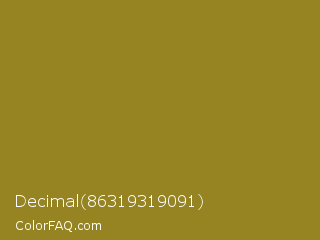Decimal 86319319091 Color is a normal yellow color and the nearest color is Hacienda #98811b. Hex code #958421 and RGB value is rgb(149,132,33). In RGB color space, this color is composed of 58% red, 52% green, 13% blue, In CMYK color space, this color is composed of 0% cyan, 11% magenta, 78% yellow , 42% black , In HSL color space, this color has a hue angle of 51° , 64% saturation and 36% lightness.