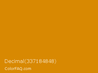 Decimal 337184848 Color is a normal orange color and the nearest color is Harvest Gold #da9100. Hex code #d88902 and RGB value is rgb(216,137,2). In RGB color space, this color is composed of 85% red, 54% green, 1% blue, In CMYK color space, this color is composed of 0% cyan, 37% magenta, 99% yellow , 15% black , In HSL color space, this color has a hue angle of 38° , 98% saturation and 43% lightness.