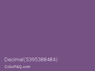 Decimal 5395388484 Color is a normal purple color and the nearest color is Dark Lavender #734f96. Hex code #765184 and RGB value is rgb(118,81,132). In RGB color space, this color is composed of 46% red, 32% green, 52% blue, In CMYK color space, this color is composed of 11% cyan, 39% magenta, 0% yellow , 48% black , In HSL color space, this color has a hue angle of 284° , 24% saturation and 42% lightness.