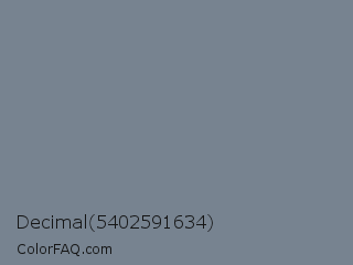 Decimal 5402591634 Color is a normal blue color and the nearest color is Slate Gray #708090. Hex code #778390 and RGB value is rgb(119,131,144). In RGB color space, this color is composed of 47% red, 51% green, 56% blue, In CMYK color space, this color is composed of 17% cyan, 9% magenta, 0% yellow , 44% black , In HSL color space, this color has a hue angle of 211° , 10% saturation and 52% lightness.