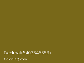 Decimal 5403346583 Color is a dark yellow color and the nearest color is Olivetone #716e10. Hex code #786819 and RGB value is rgb(120,104,25). In RGB color space, this color is composed of 47% red, 41% green, 10% blue, In CMYK color space, this color is composed of 0% cyan, 13% magenta, 79% yellow , 53% black , In HSL color space, this color has a hue angle of 50° , 66% saturation and 28% lightness.