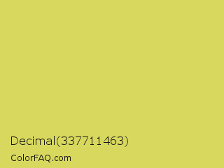 Decimal 337711463 Color is a light yellow color and the nearest color is Booger Buster #dde26a. Hex code #d8d85f and RGB value is rgb(216,216,95). In RGB color space, this color is composed of 85% red, 85% green, 37% blue, In CMYK color space, this color is composed of 0% cyan, 0% magenta, 56% yellow , 15% black , In HSL color space, this color has a hue angle of 60° , 61% saturation and 61% lightness.