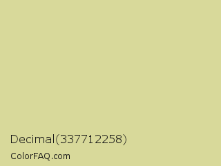 Decimal 337712258 Color is a light yellow color and the nearest color is Deco #d2da97. Hex code #d8d99a and RGB value is rgb(216,217,154). In RGB color space, this color is composed of 85% red, 85% green, 60% blue, In CMYK color space, this color is composed of 0% cyan, 0% magenta, 29% yellow , 15% black , In HSL color space, this color has a hue angle of 61° , 45% saturation and 73% lightness.