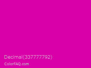 Decimal 337777792 Color is a normal magenta color and the nearest color is Hollywood Cerise #f400a1. Hex code #d900a8 and RGB value is rgb(217,0,168). In RGB color space, this color is composed of 85% red, 0% green, 66% blue, In CMYK color space, this color is composed of 0% cyan, 100% magenta, 23% yellow , 15% black , In HSL color space, this color has a hue angle of 314° , 100% saturation and 43% lightness.