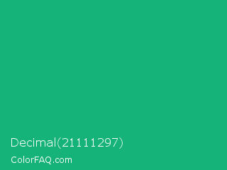 Decimal 21111297 Color is a normal green color and the nearest color is Green Crayola #1cac78. Hex code #15b379 and RGB value is rgb(21,179,121). In RGB color space, this color is composed of 8% red, 70% green, 47% blue, In CMYK color space, this color is composed of 88% cyan, 0% magenta, 32% yellow , 30% black , In HSL color space, this color has a hue angle of 158° , 79% saturation and 39% lightness.