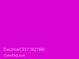Decimal 337782788 Color is a normal magenta color and the nearest color is Deep Magenta #cc00cc. Hex code #d905d4 and RGB value is rgb(217,5,212). In RGB color space, this color is composed of 85% red, 2% green, 83% blue, In CMYK color space, this color is composed of 0% cyan, 98% magenta, 2% yellow , 15% black , In HSL color space, this color has a hue angle of 301° , 95% saturation and 44% lightness.