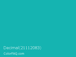 Decimal 21112083 Color is a normal cyan color and the nearest color is Tiffany Blue #0abab5. Hex code #15b4b1 and RGB value is rgb(21,180,177). In RGB color space, this color is composed of 8% red, 71% green, 69% blue, In CMYK color space, this color is composed of 88% cyan, 0% magenta, 2% yellow , 29% black , In HSL color space, this color has a hue angle of 179° , 79% saturation and 39% lightness.