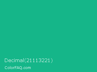 Decimal 21113221 Color is a normal green color and the nearest color is Mountain Meadow Crayola #1ab385. Hex code #15b689 and RGB value is rgb(21,182,137). In RGB color space, this color is composed of 8% red, 71% green, 54% blue, In CMYK color space, this color is composed of 88% cyan, 0% magenta, 25% yellow , 29% black , In HSL color space, this color has a hue angle of 163° , 79% saturation and 40% lightness.