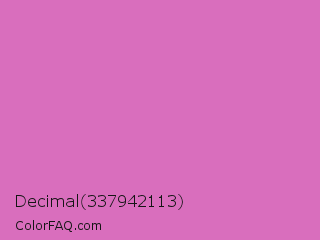 Decimal 337942113 Color is a light magenta color and the nearest color is Sky Magenta #cf71af. Hex code #d96ebd and RGB value is rgb(217,110,189). In RGB color space, this color is composed of 85% red, 43% green, 74% blue, In CMYK color space, this color is composed of 0% cyan, 49% magenta, 13% yellow , 15% black , In HSL color space, this color has a hue angle of 316° , 58% saturation and 64% lightness.