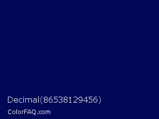 Decimal 86538129456 Color is a very dark blue color and the nearest color is Gulf Blue #051657. Hex code #010856 and RGB value is rgb(1,8,86). In RGB color space, this color is composed of 0% red, 3% green, 34% blue, In CMYK color space, this color is composed of 99% cyan, 91% magenta, 0% yellow , 66% black , In HSL color space, this color has a hue angle of 235° , 98% saturation and 17% lightness.